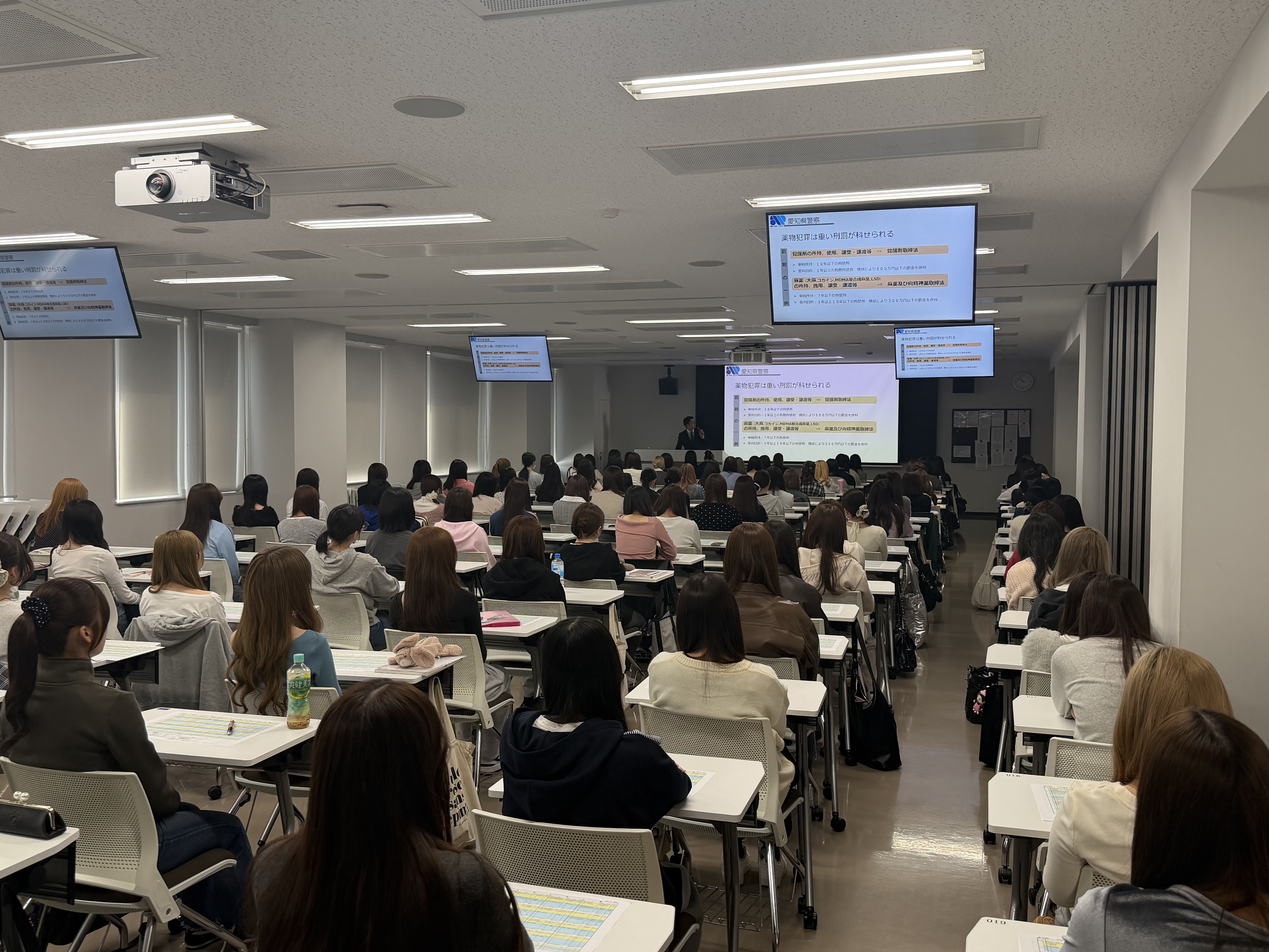 当日は、愛知県警察本部 刑事部 組織犯罪対策局 薬物銃器対策課の警察官を講師としてお招きし、近年の薬物犯罪情勢や、SNSを通じた勧誘の実態、犯罪に巻き込まれないためのポイントについてご講話いただきました。